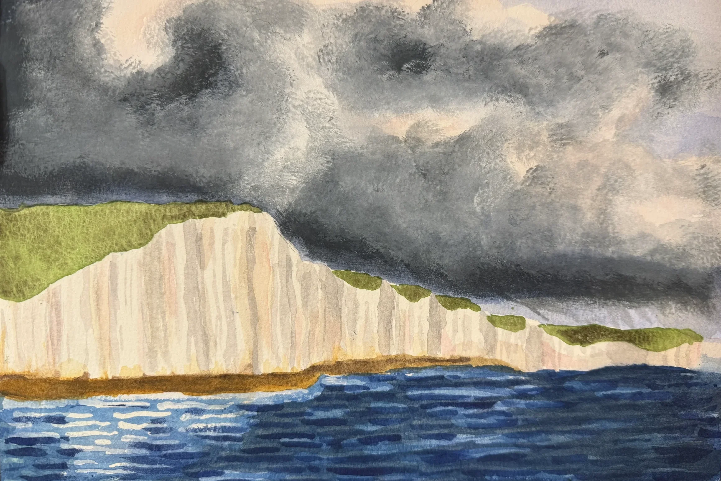 I added some blue-grey shading to the left side of the cliffs and some warmer greys to the right. I also added a bit of blue to the green apatite to create a dark and more blueish cloud shadow to the cliff greens. I also added some dark blue-gray to the right side of the ocean - using some negative space painting to allow some lighter hues to show through